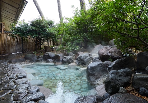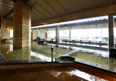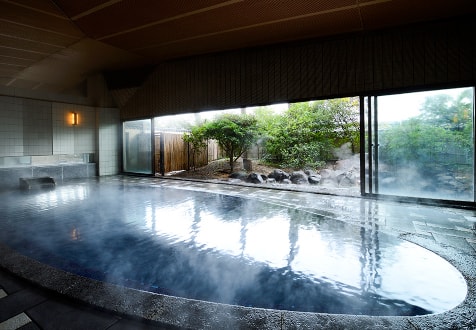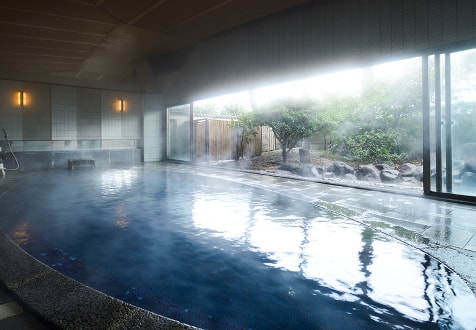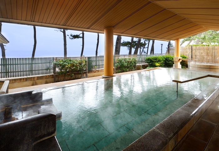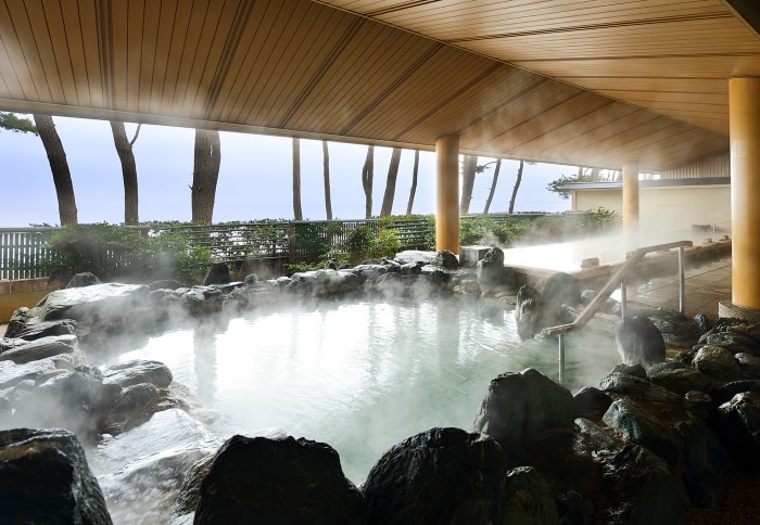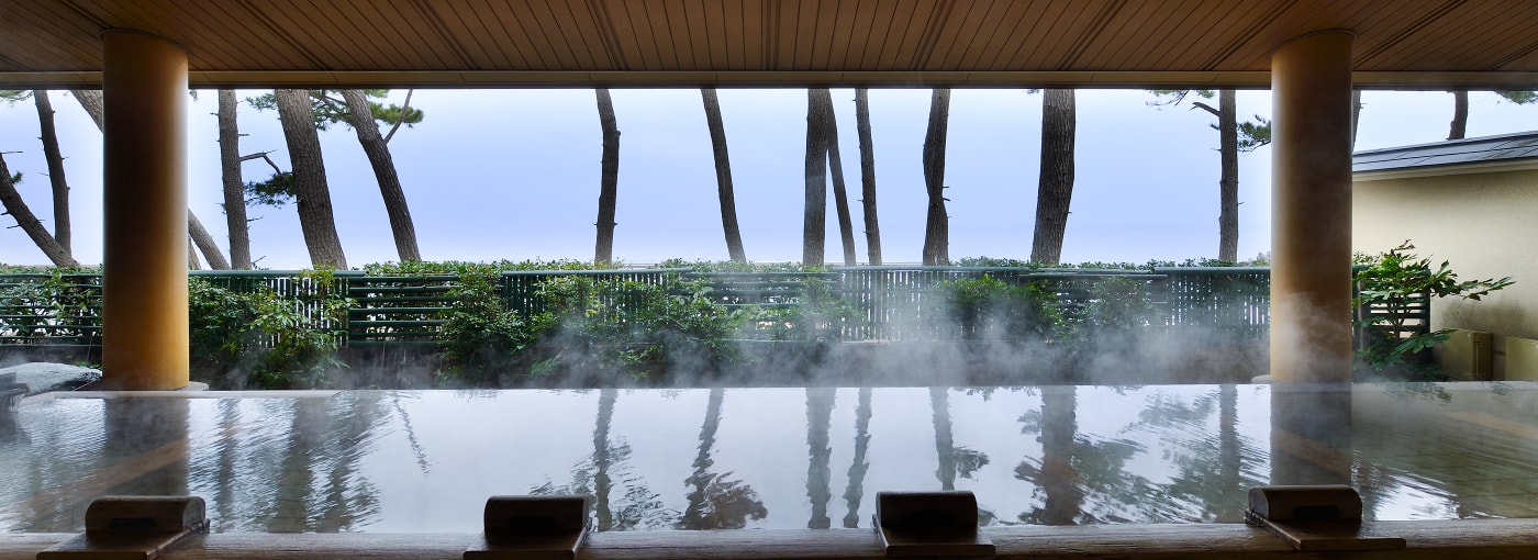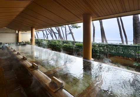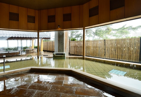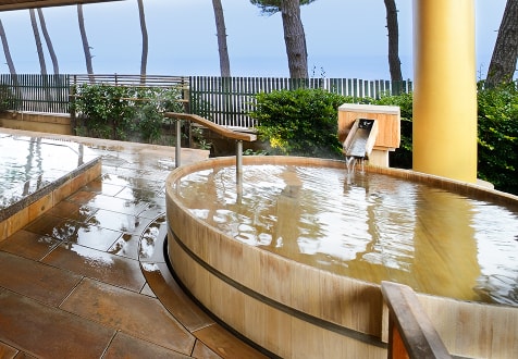 本館一階の「渚の湯」も大浴場はもちろん、露天風呂がございますので自然を愉しんでいただけます。夜になると庭がライトアップされますので、湯けむりが立ち上るのを眺めながら当館ならではの源泉かけ流しの湯でゆっくりとおくつろぎください。