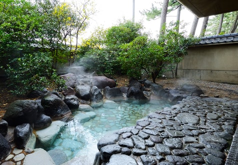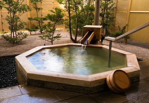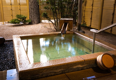 華水館一階の「華の湯」は室内の大浴場と庭のある露天風呂がございます。庭に囲まれた露天風呂では日本海のさざ波の音や潮風をお愉しみいただけます。夜にはライトアップされた庭の木々と立ち上るの湯けむりが幻想的な空間へと誘ってくれます。