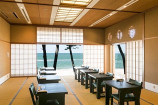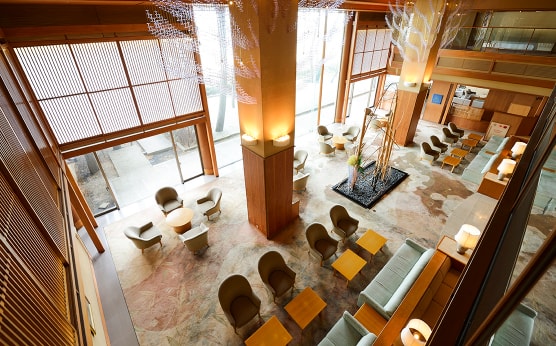 お客様をお出迎えする玄関では、飛天の滝の水の音が旅の疲れを癒やしてくれます。 また、皆生の海が見渡せるロビーラウンジでゆっくりとおくつろぎください。隣接する「プラジュ」のお飲み物もご利用いただけます。