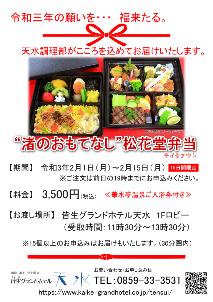 このたび、姉妹館「皆生グランドホテル天水」の調理部が心を込めて作る“渚のおもてなし”松花堂弁当の販売を開始いたします。