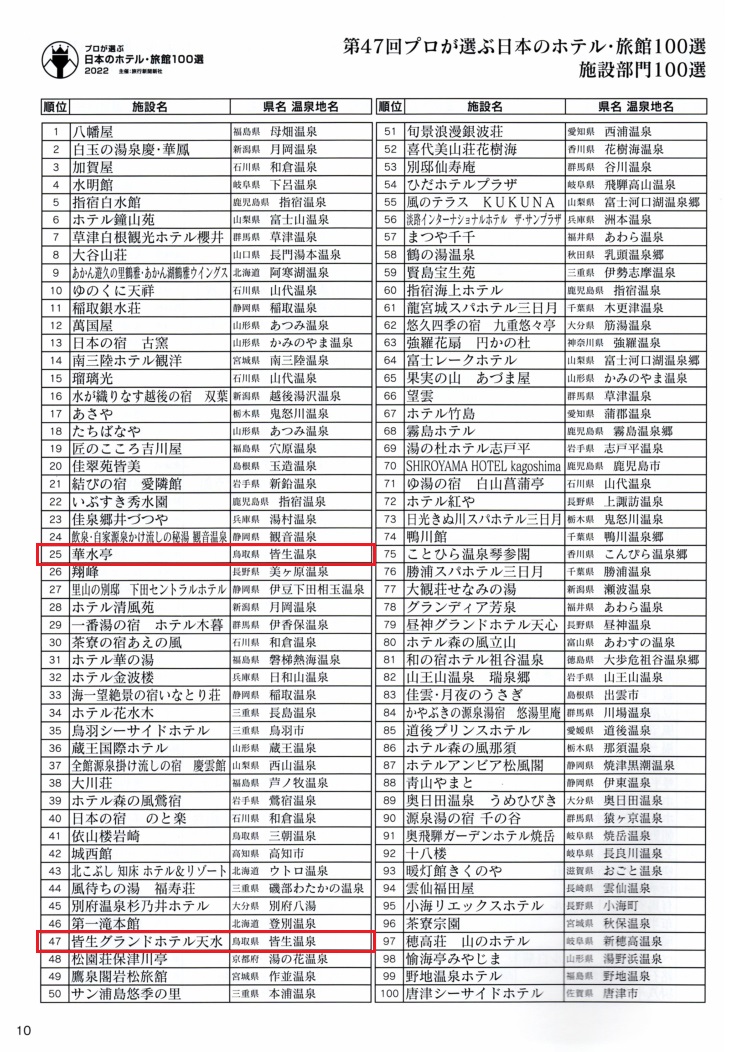 姉妹館の「皆生グランドホテル天水」も、施設部門で47位に選ばれました。