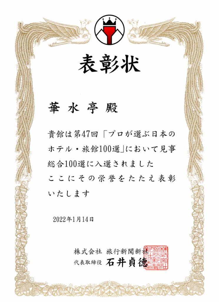 2022年の第47回「プロが選ぶ日本のホテル・旅館100選」にて華水亭が総合41位、施設部門で25位に選出されました。