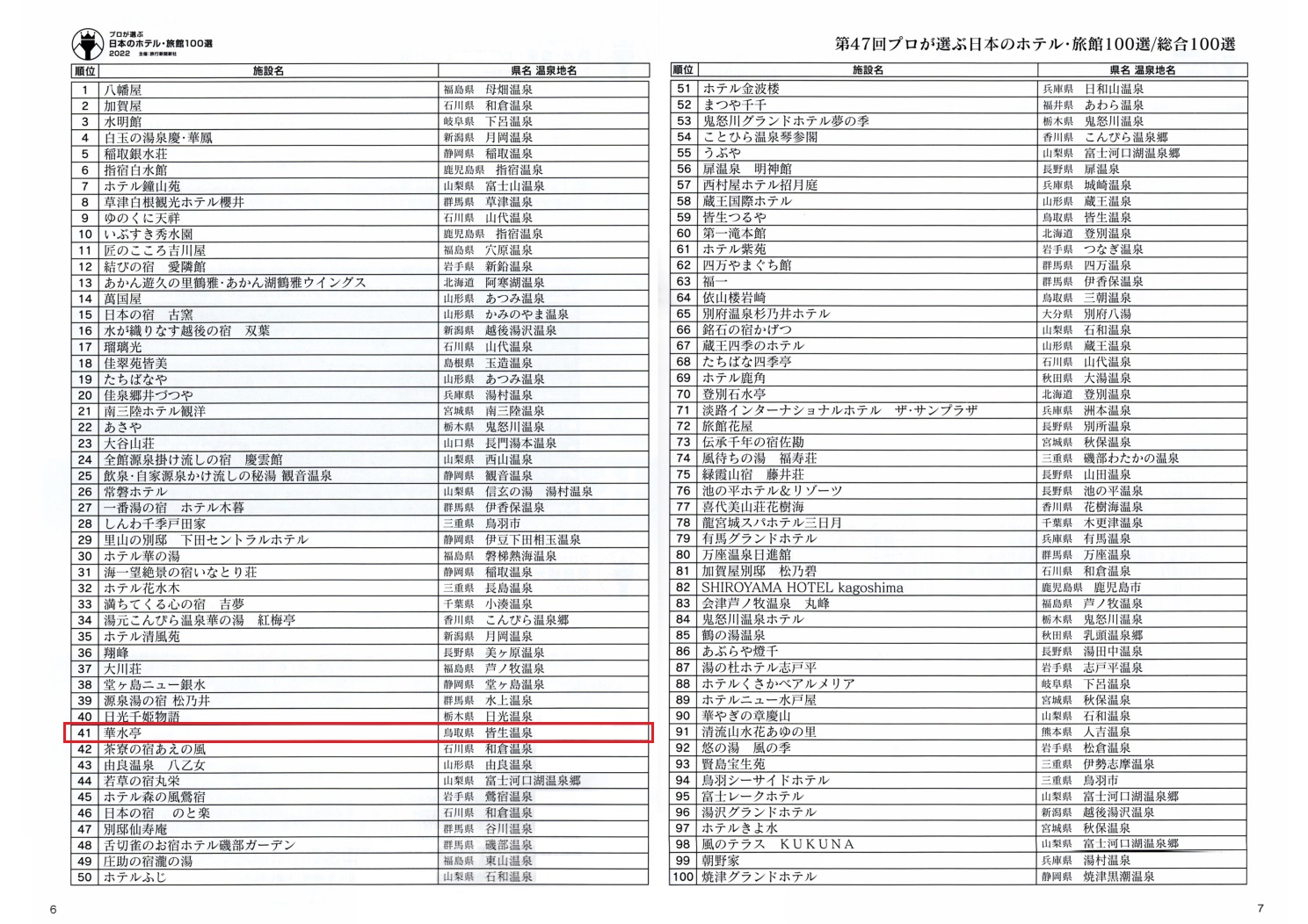 第47回「プロが選ぶ日本のホテル・旅館100選」総合・施設部門W入選!!