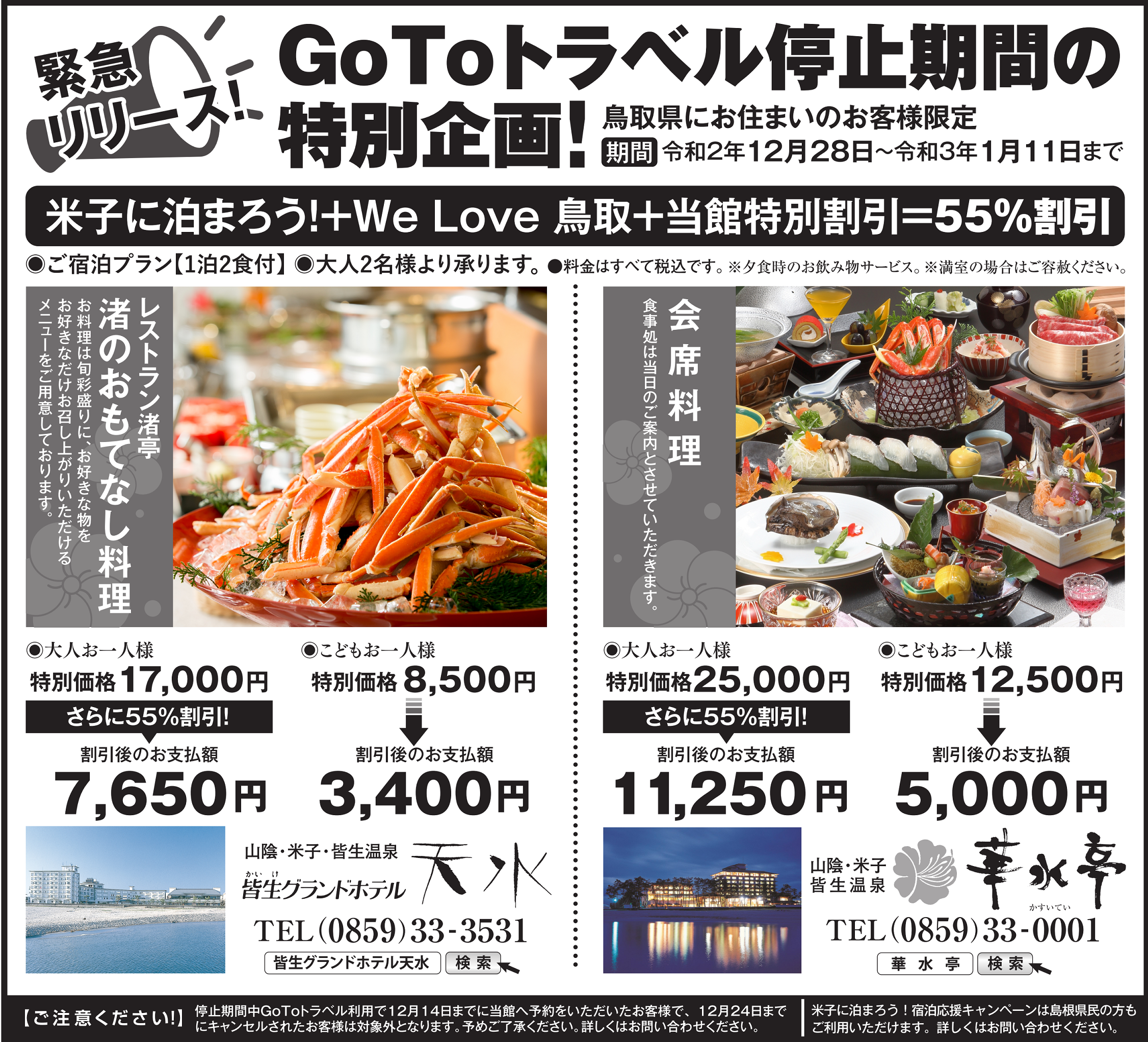 「米子に泊まろう!」+「#WeLove鳥取」+「当館特別割引」で、なんと55%割引!!!