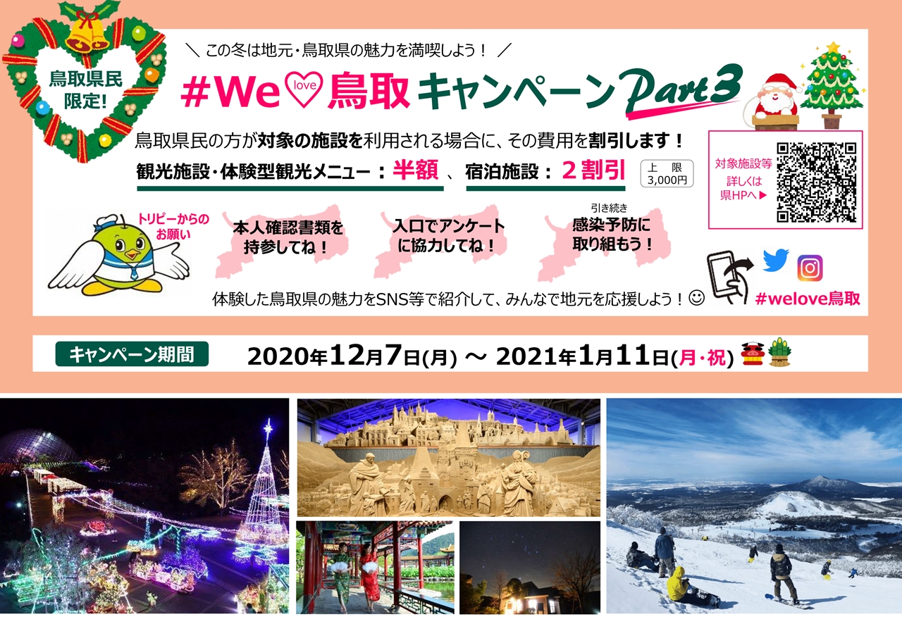 鳥取県民が対象の県内観光施設や宿泊施設等を利用される場合の費用を割引する「#WeLove鳥取キャンペーンPart3」が本日12月7日(月)よりスタートしました!!