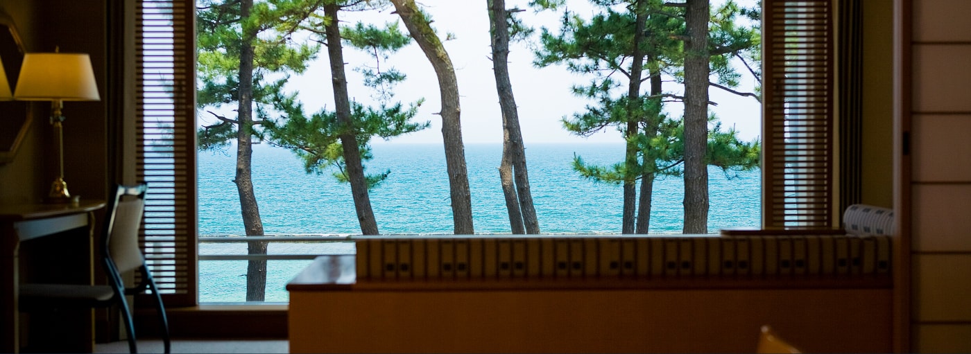 広々とした純和風の落ち着いた空間で、お部屋に入った瞬間に日本海を一望できます。四季折々の風景を愛でながらご家族やご友人とのくつろぎのひとときを。